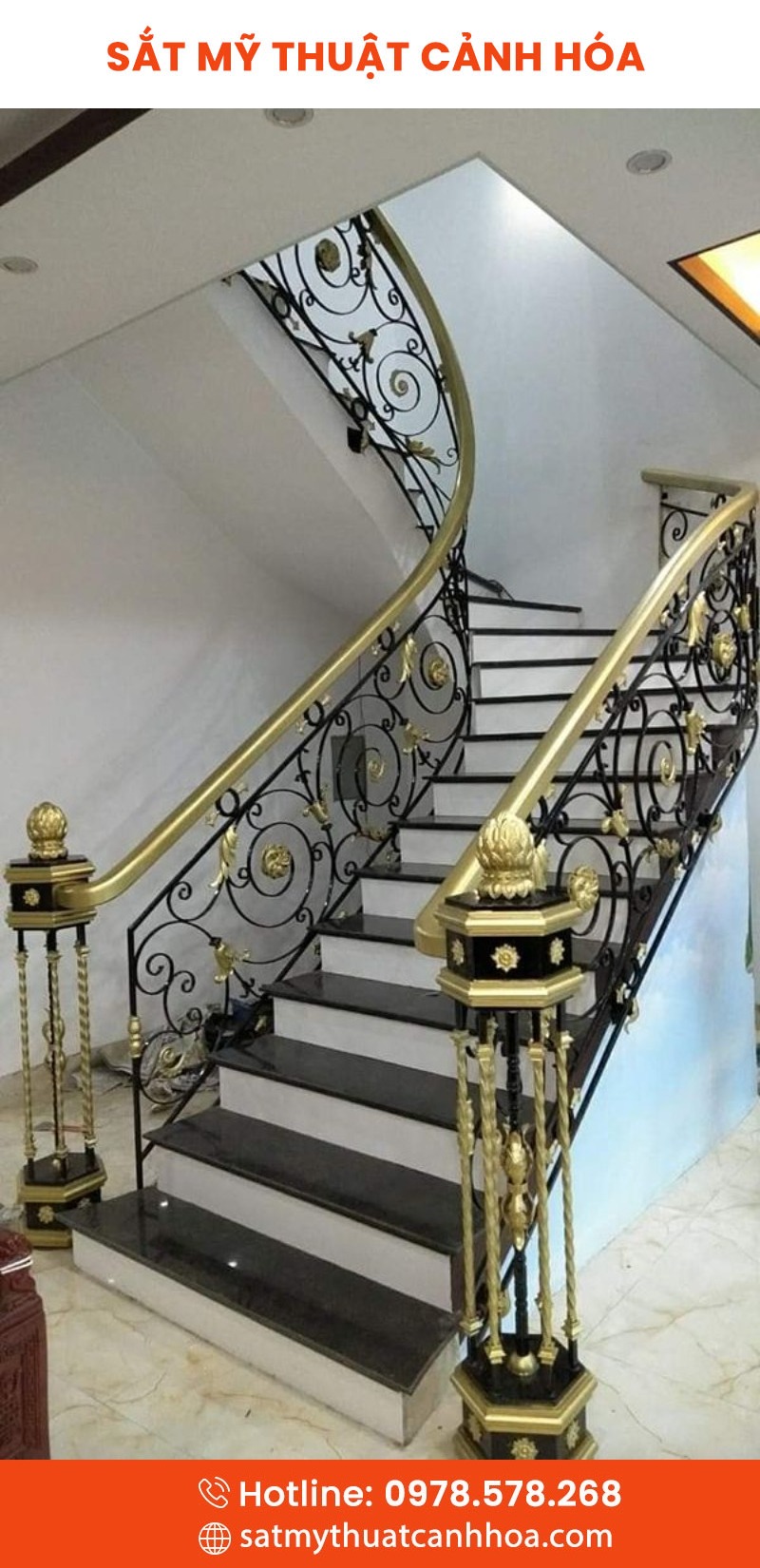 Cầu thang sắt mỹ thuật CTS-106 là sản phẩm nổi bật tại Sắt Nghệ Thuật Cảnh Hóa, kết hợp hài hòa giữa giá trị nghệ thuật và độ bền chắc chắn. Được chế tác từ sắt đặc cao cấp, uốn hoa văn tinh xảo, phủ sơn tĩnh điện chống gỉ, mỗi mẫu cầu thang đều mang đến vẻ đẹp độc bản và trường tồn theo thời gian.